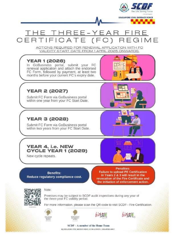 To help businesses reduce regulatory compliance costs, SCDF will implement extended Fire Certificate (FC) validity period of three years for renewal starting from 1 April 2026 onwards. Under this new regime, you only need to submit renewal applications only once every three years, at least two months prior to expiry.